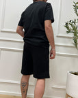Bermuda color nero Gaelle Paris. Modello con coulisse in vita, con lacci a contrasto. Dettaglio di logo sul fondo.