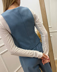Gilet color polvere Tensione In. Modello basic con scollo a v e chiusura a quattro bottoni. Tasche a filetto frontali.
