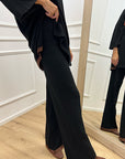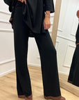 Pantalone color nero in misto lana e cashmere Akep. Modello a zampa con vita alta, elastico in vita. Dettaglio di bordo lurex bronzo sul fondo.