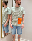 T shirt rigata sui toni del verde oliva e bianco Anerkjendt. Modello basico a manica corta, dettaglio di tasca arancio sul davanti. Retro monocromo verde oliva.